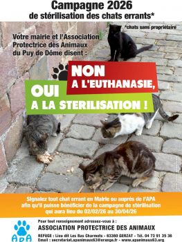En partenariat avec les communes, l’Association Protectrice des Animaux du Puy-de-Dôme lance sa campagne 2026 de stérilisation des chats errants, c’est-à-dire sans propriétaire.